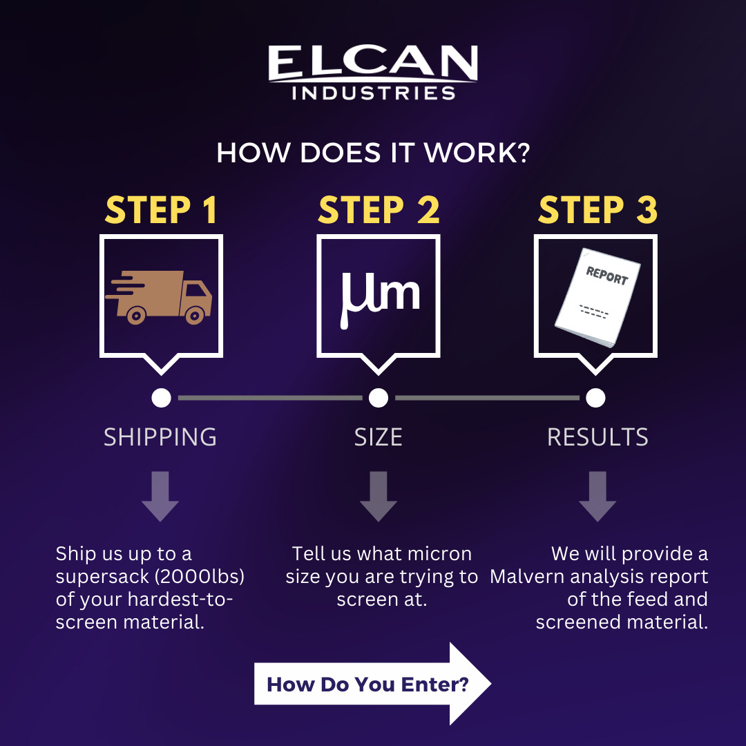 Let Elcan Industries demonstrate the superiority of our advanced sieving equipment. For a very limited time, we invite you to send us up to a supersack (2,000 lbs.) of material that your company is having difficulty screening or experiencing poor rates and yields with.